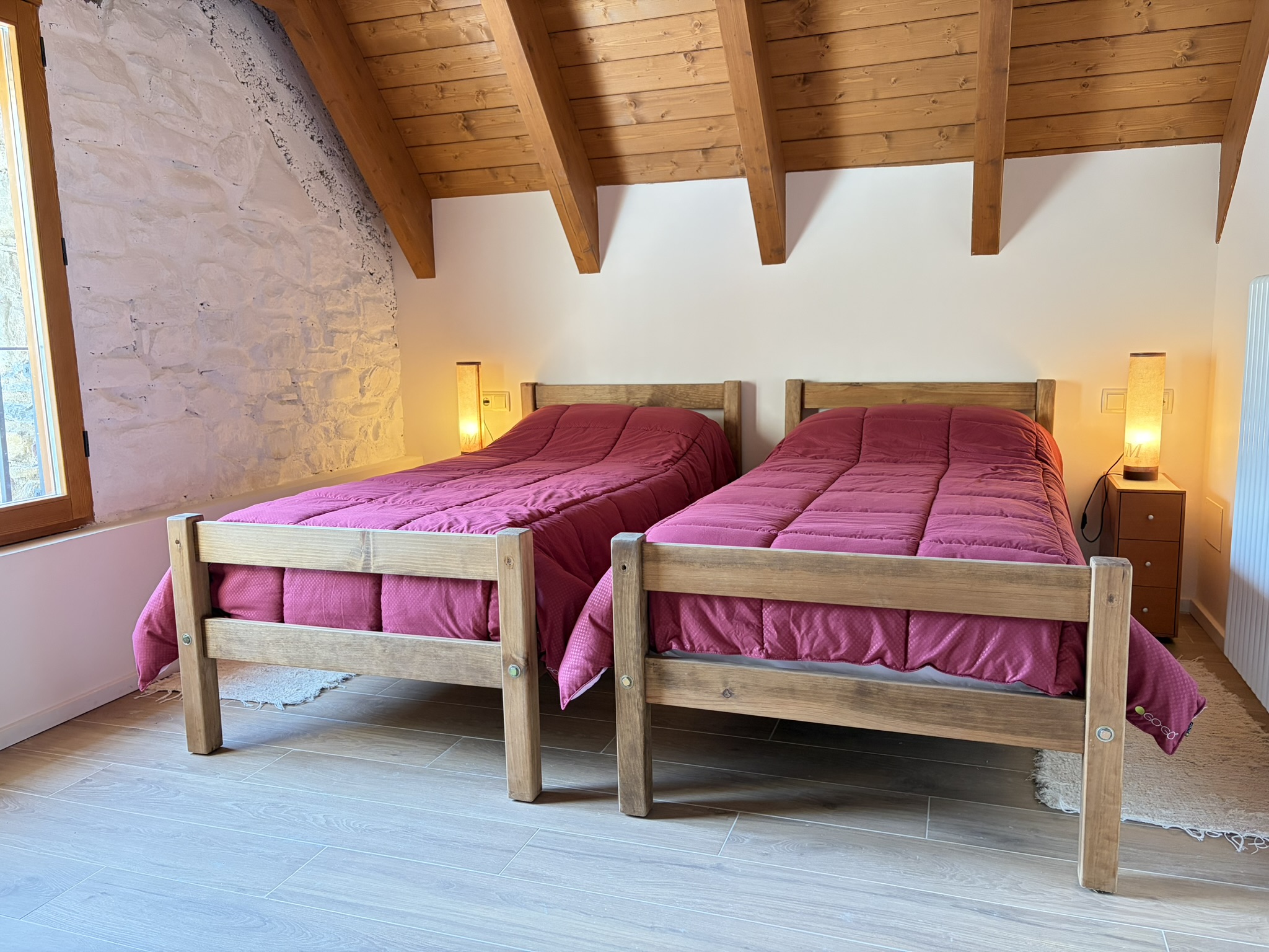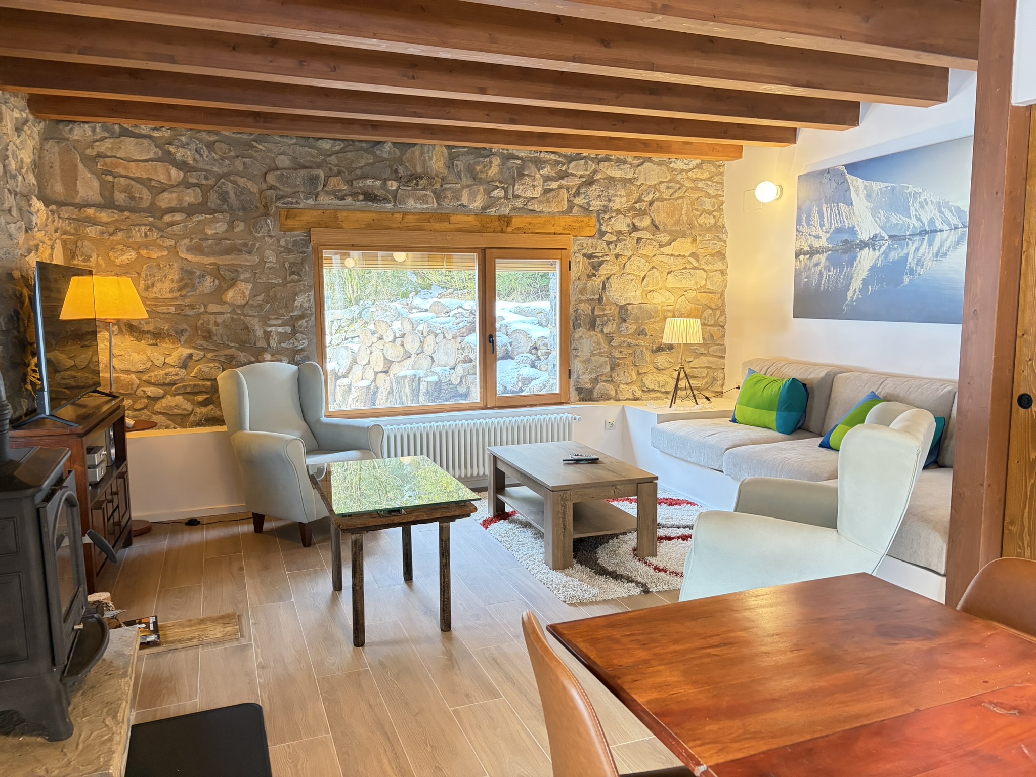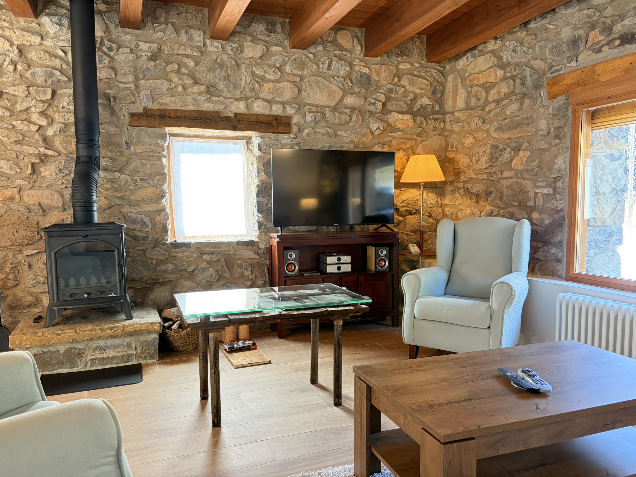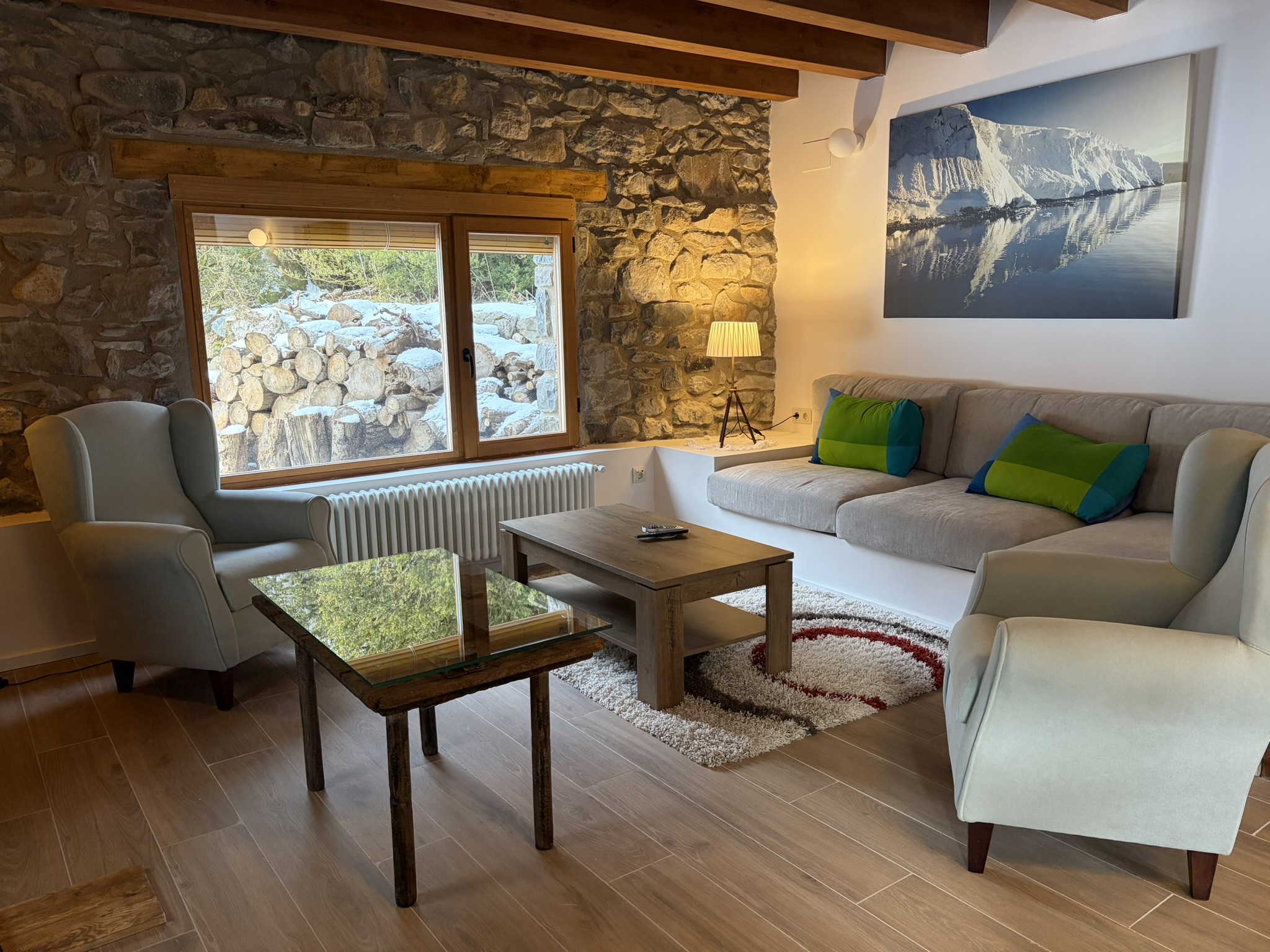 En la planta baja, el salón cuenta una confortable zona de estar con sofá y butacas y una estufa de leña, ideal para descansar después de una excursión o un día de nieve. La cocina es amplia y práctica, equipada para cocinar con comodidad. También, hay un aseo independiente. La planta superior cuenta con dos dormitorios abuhardillados: uno con cama de 180 cm y otro con dos camas de 90 cm, además de un baño con ducha.
