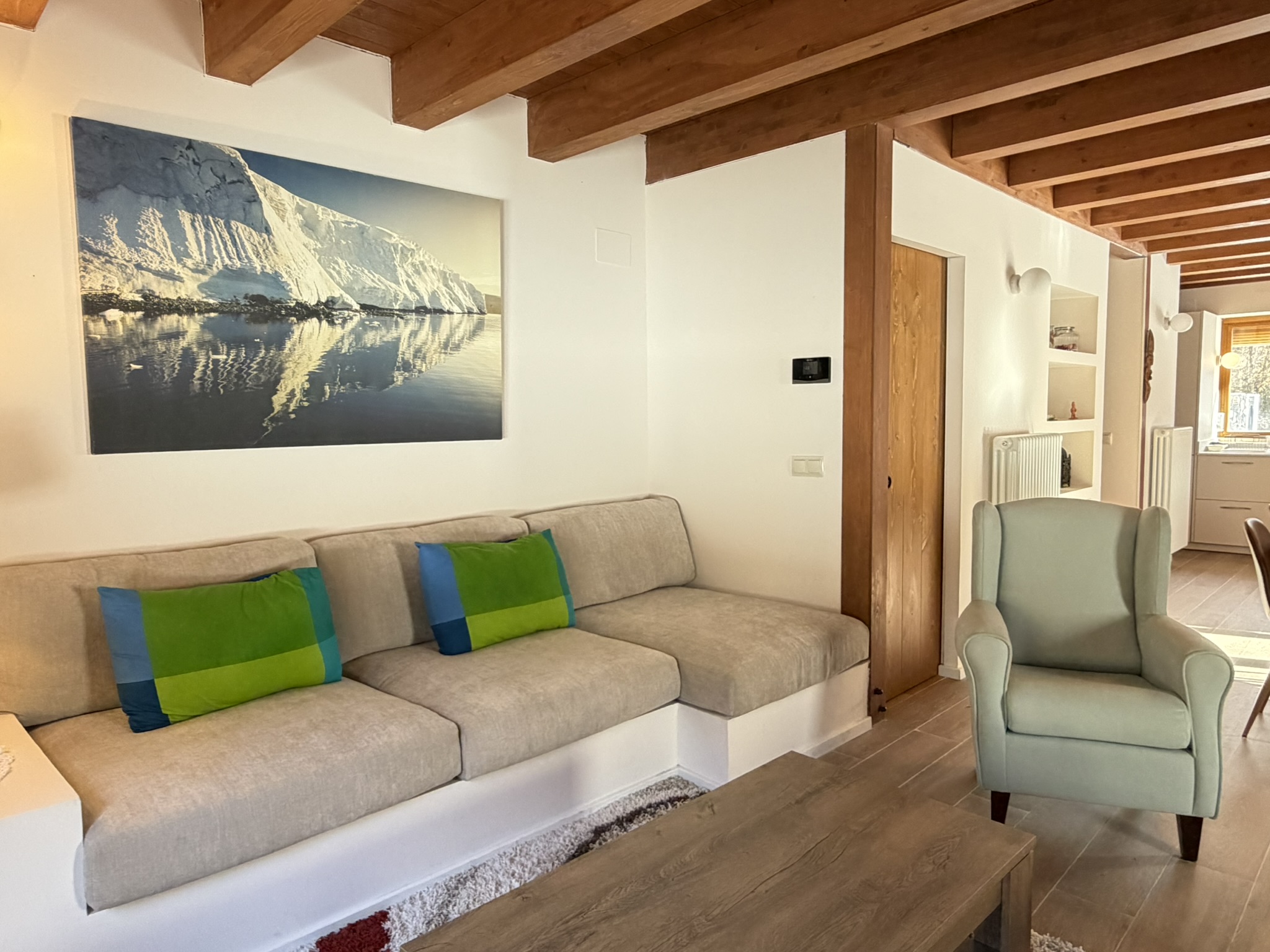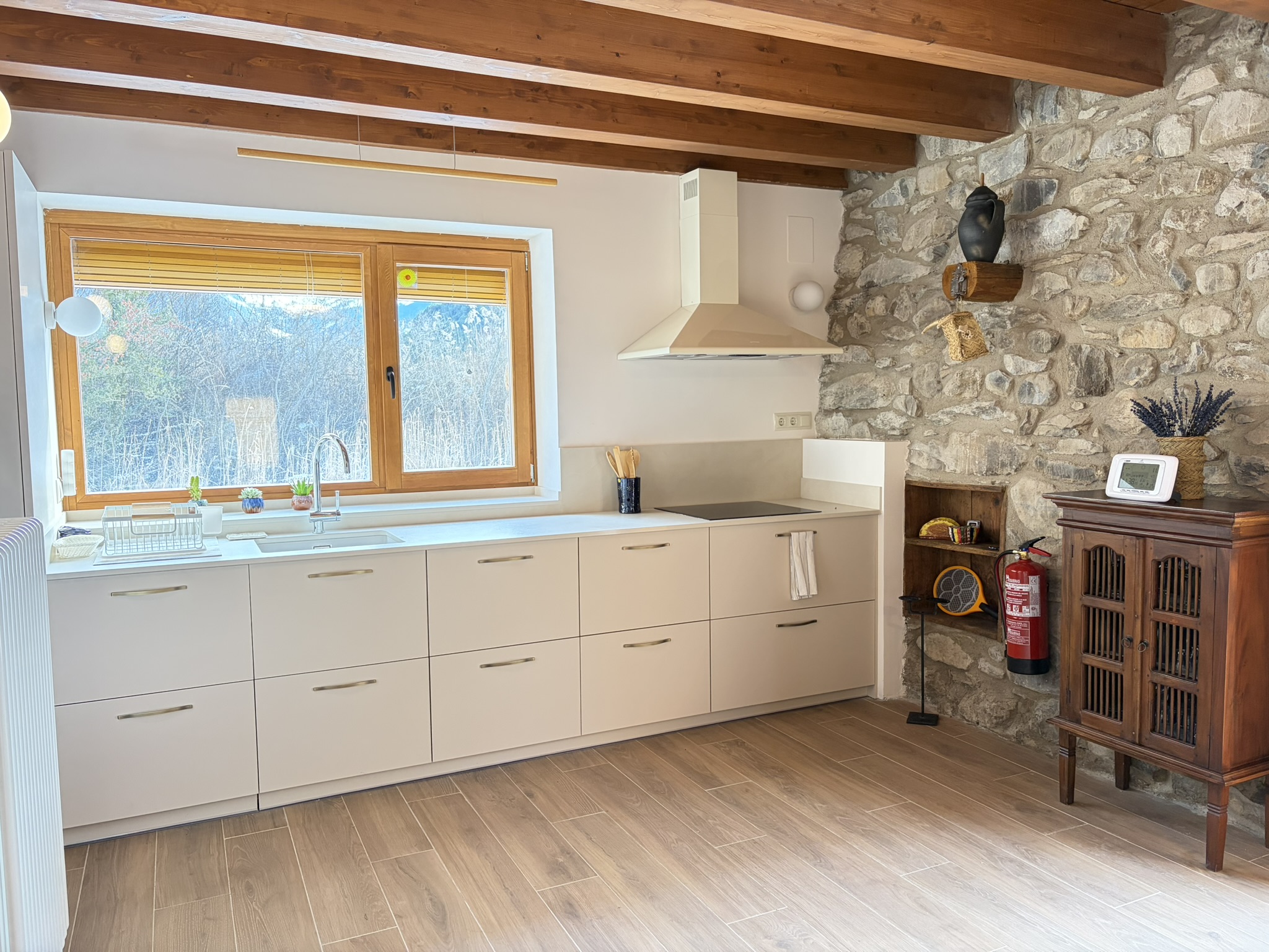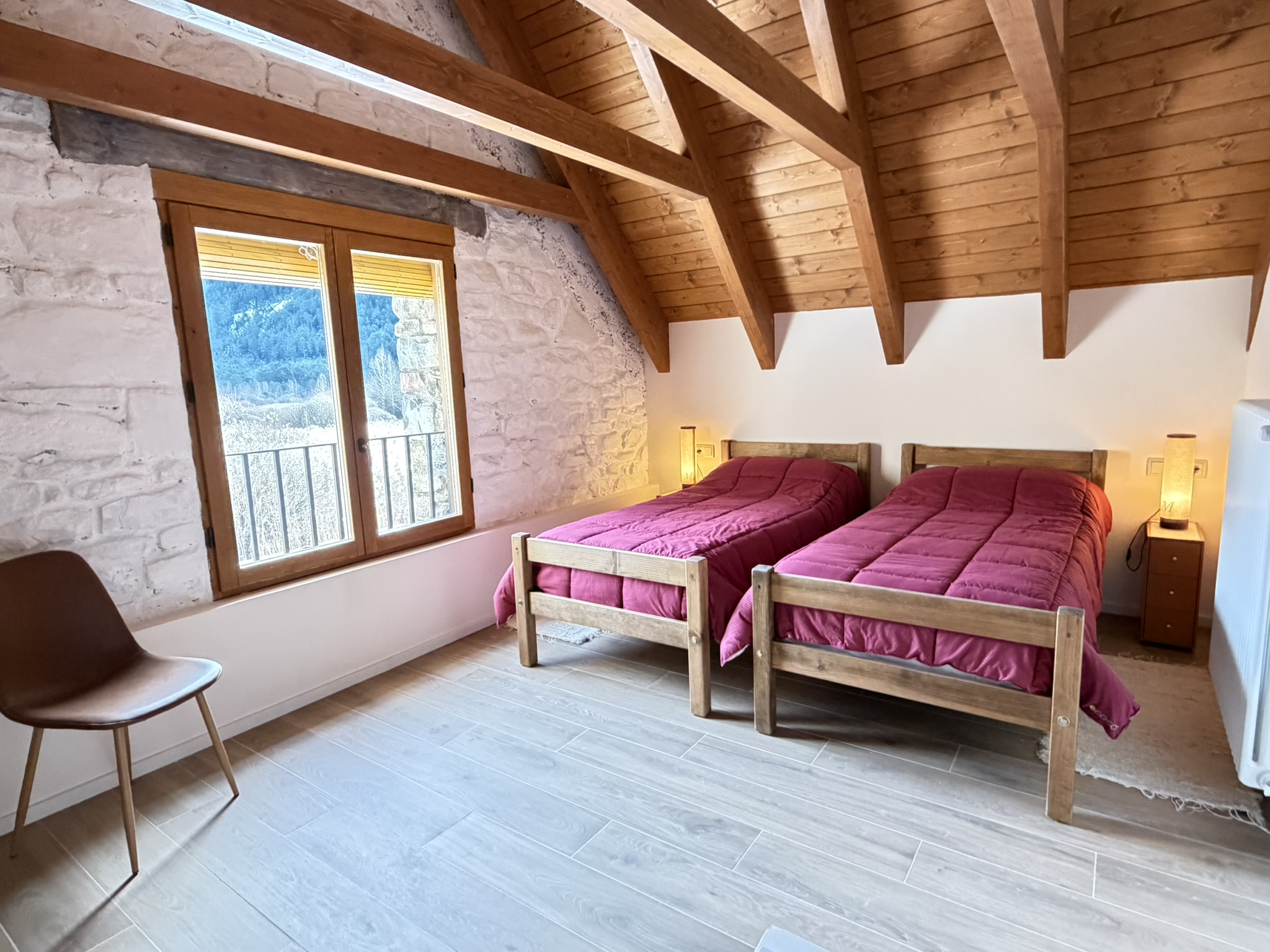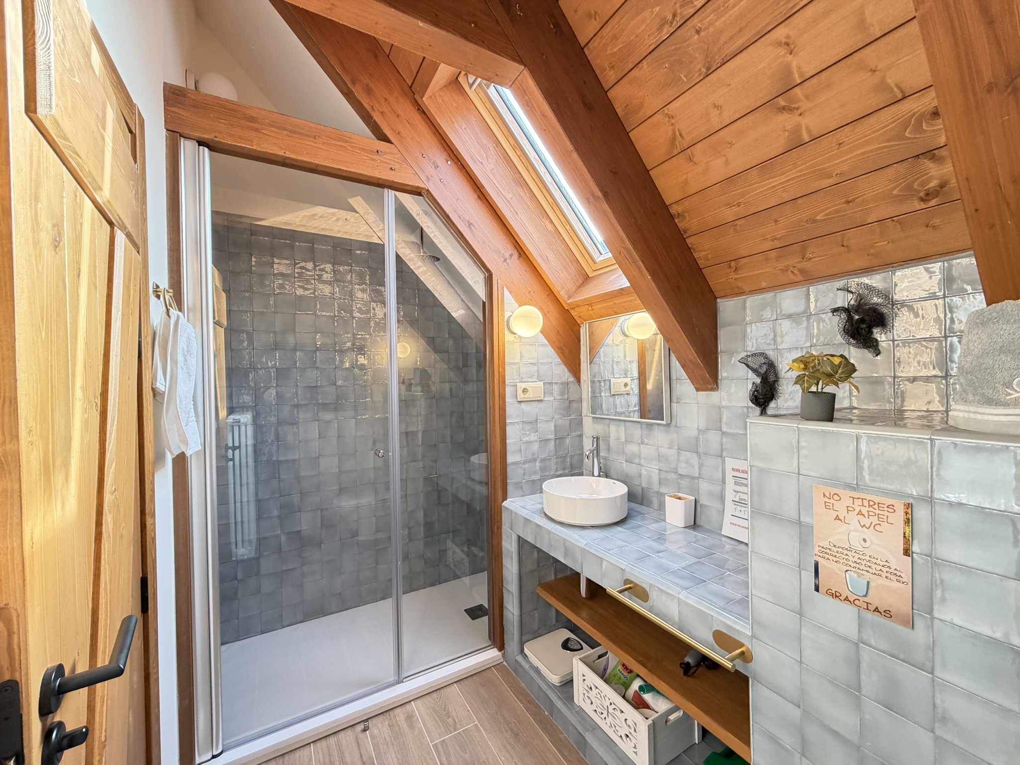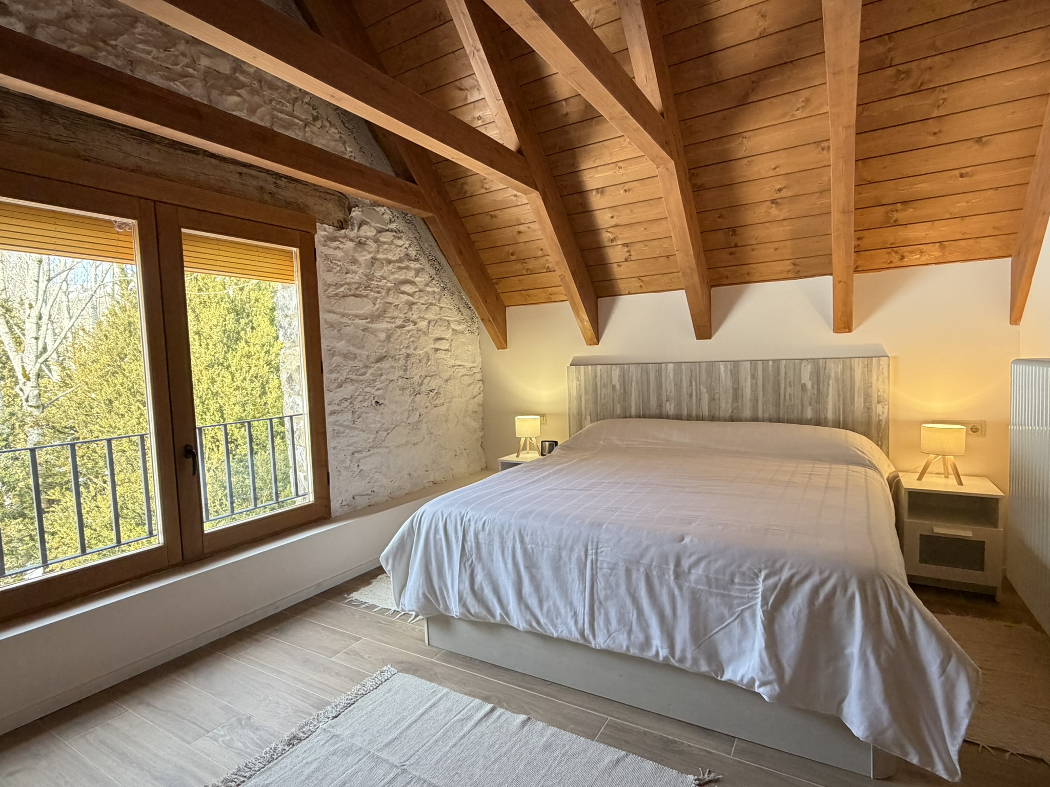 En la planta baja, el salón cuenta una confortable zona de estar con sofá y butacas y una estufa de leña, ideal para descansar después de una excursión o un día de nieve. La cocina es amplia y práctica, equipada para cocinar con comodidad. También, hay un aseo independiente. La planta superior cuenta con dos dormitorios abuhardillados: uno con cama de 180 cm y otro con dos camas de 90 cm, además de un baño con ducha.
