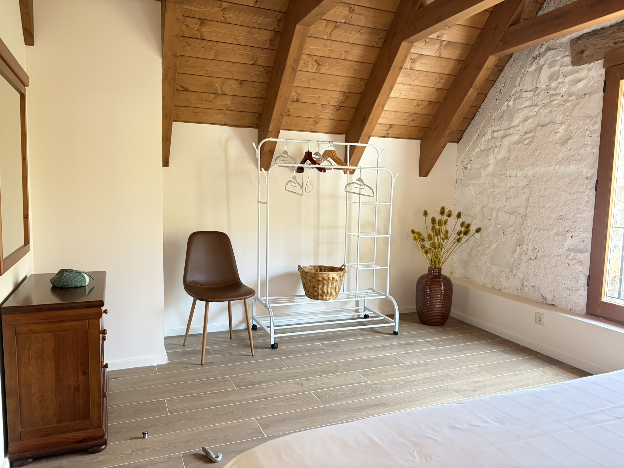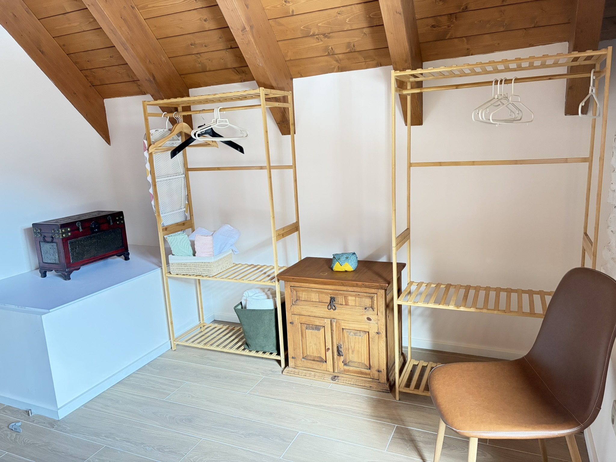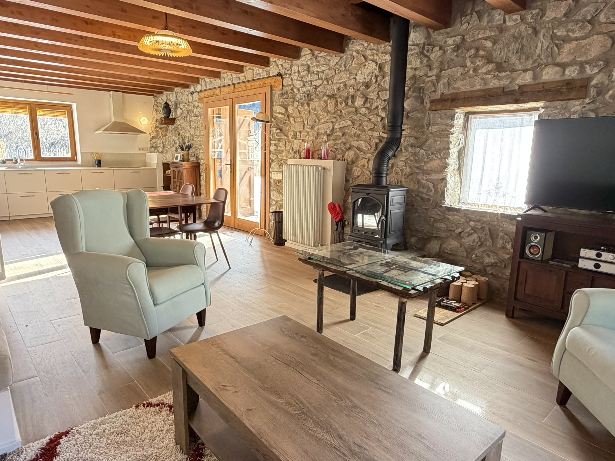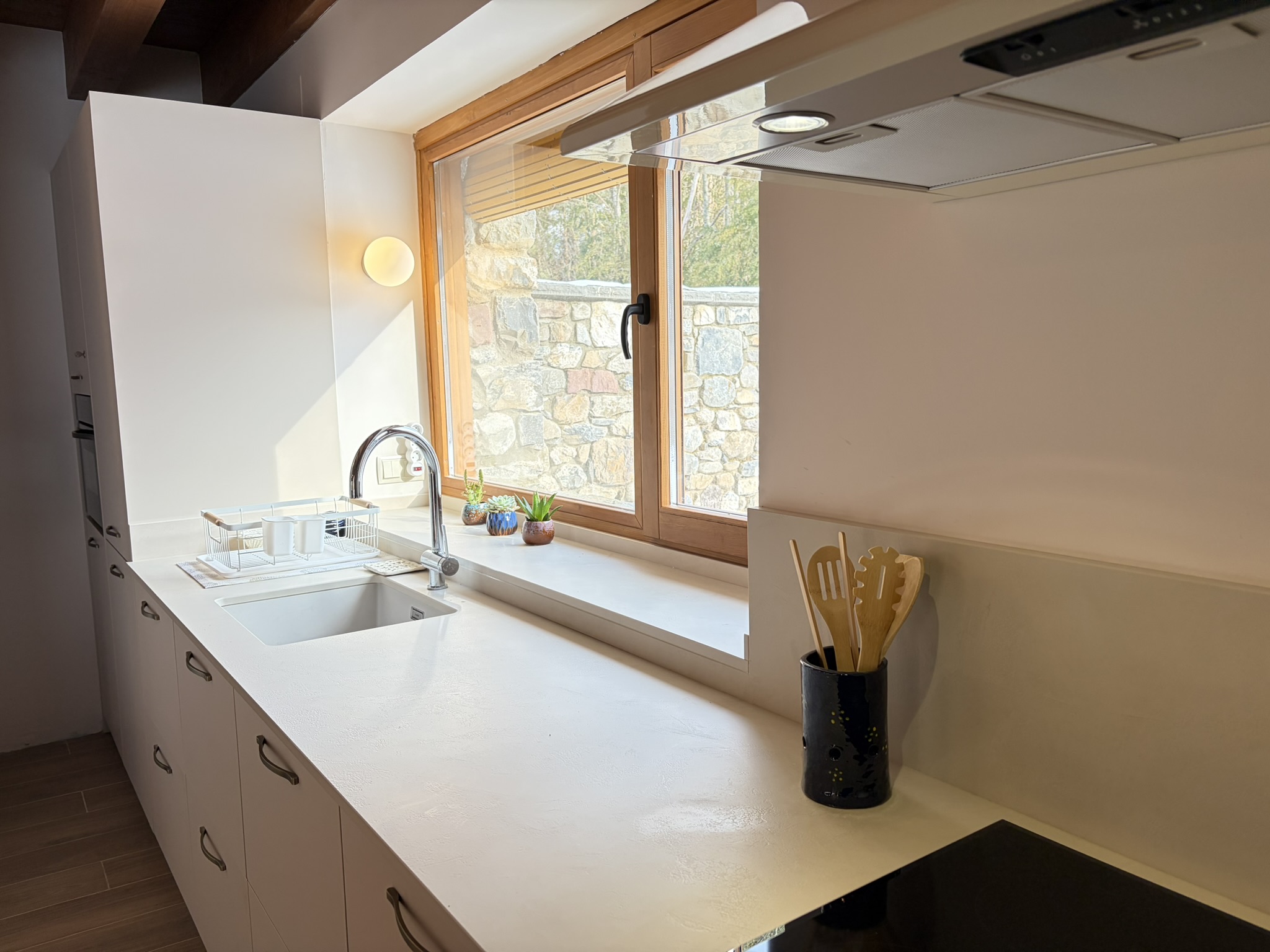 En la planta baja, el salón cuenta una confortable zona de estar con sofá y butacas y una estufa de leña, ideal para descansar después de una excursión o un día de nieve. La cocina es amplia y práctica, equipada para cocinar con comodidad. También, hay un aseo independiente. La planta superior cuenta con dos dormitorios abuhardillados: uno con cama de 180 cm y otro con dos camas de 90 cm, además de un baño con ducha.