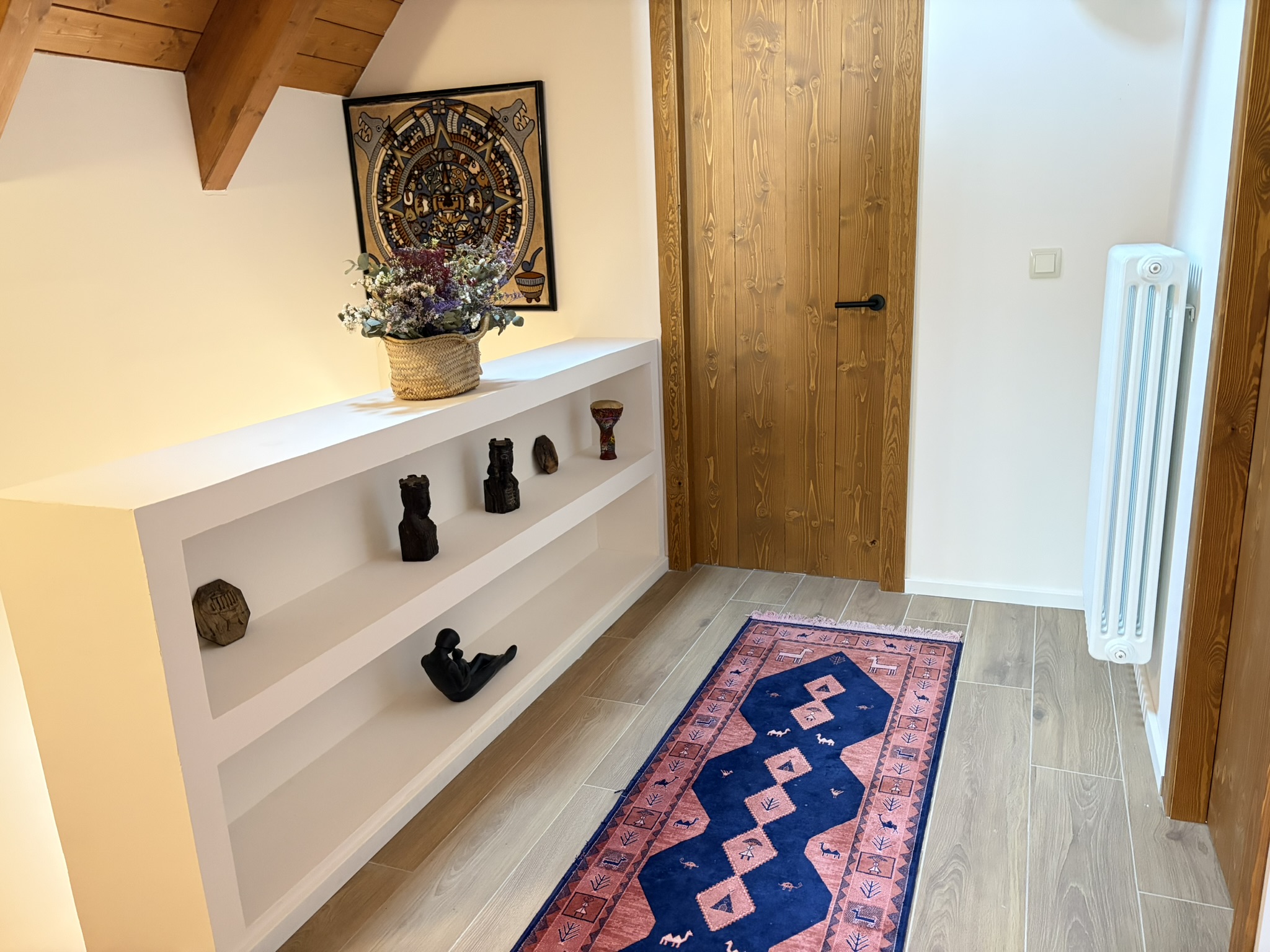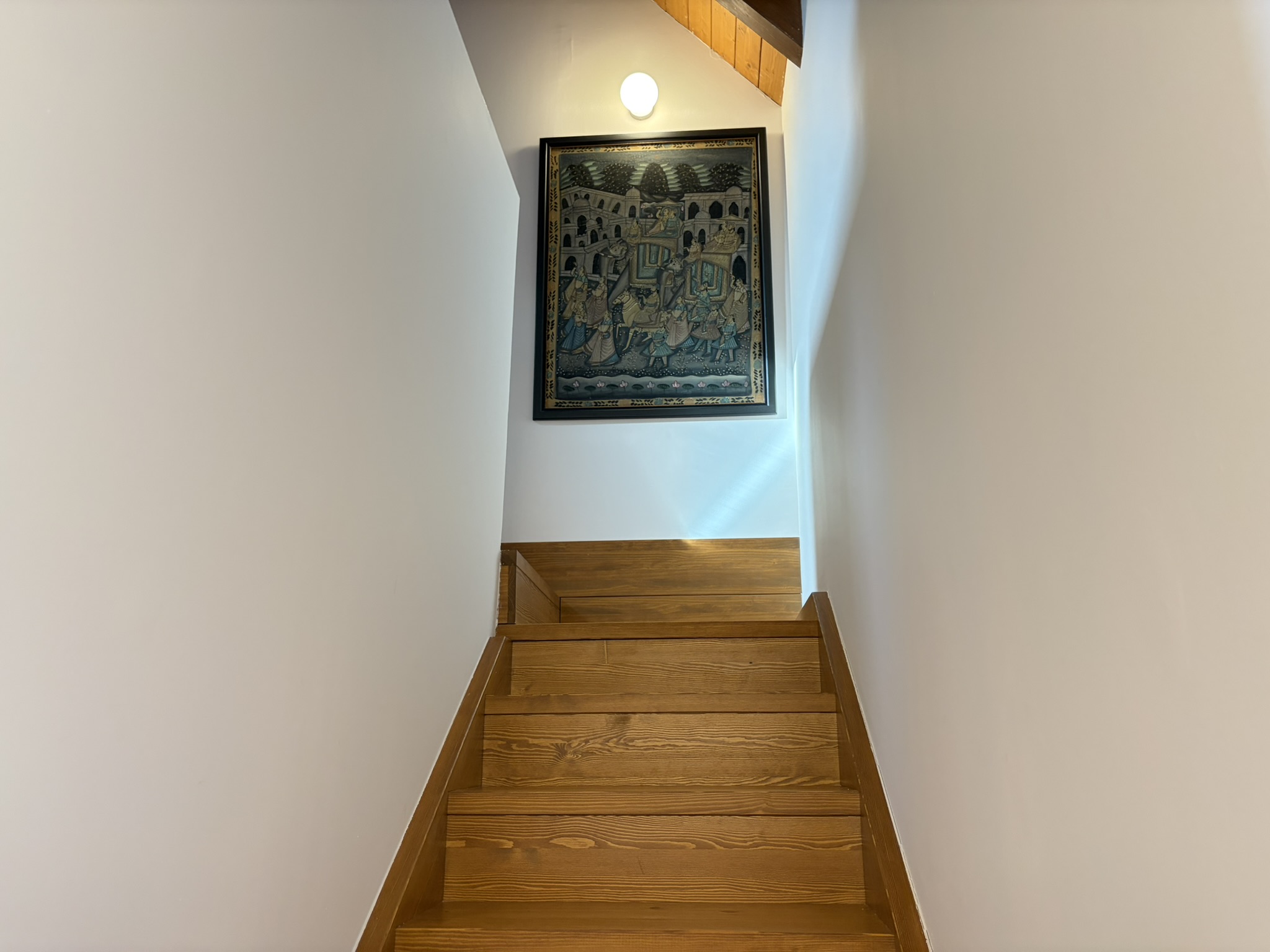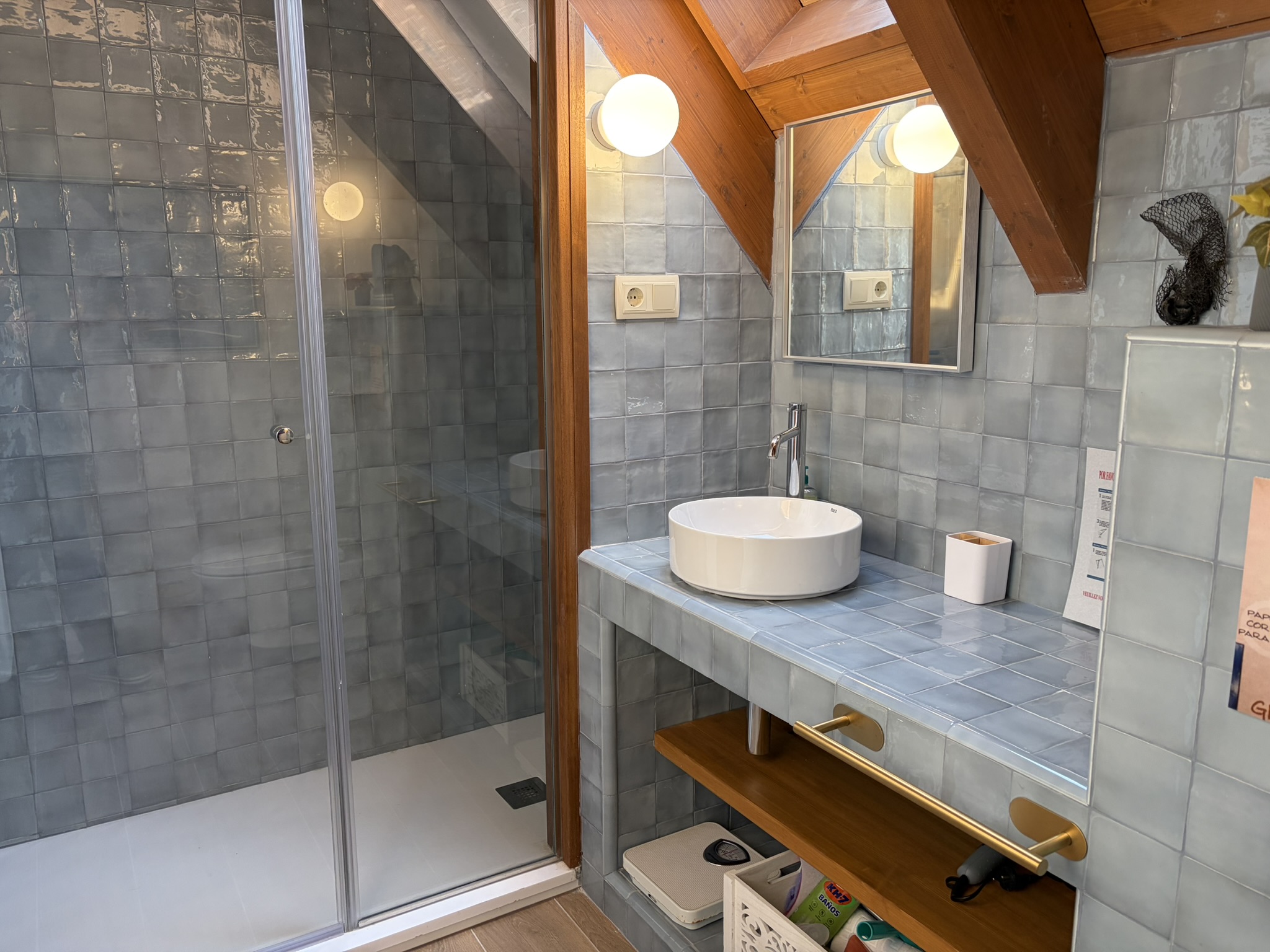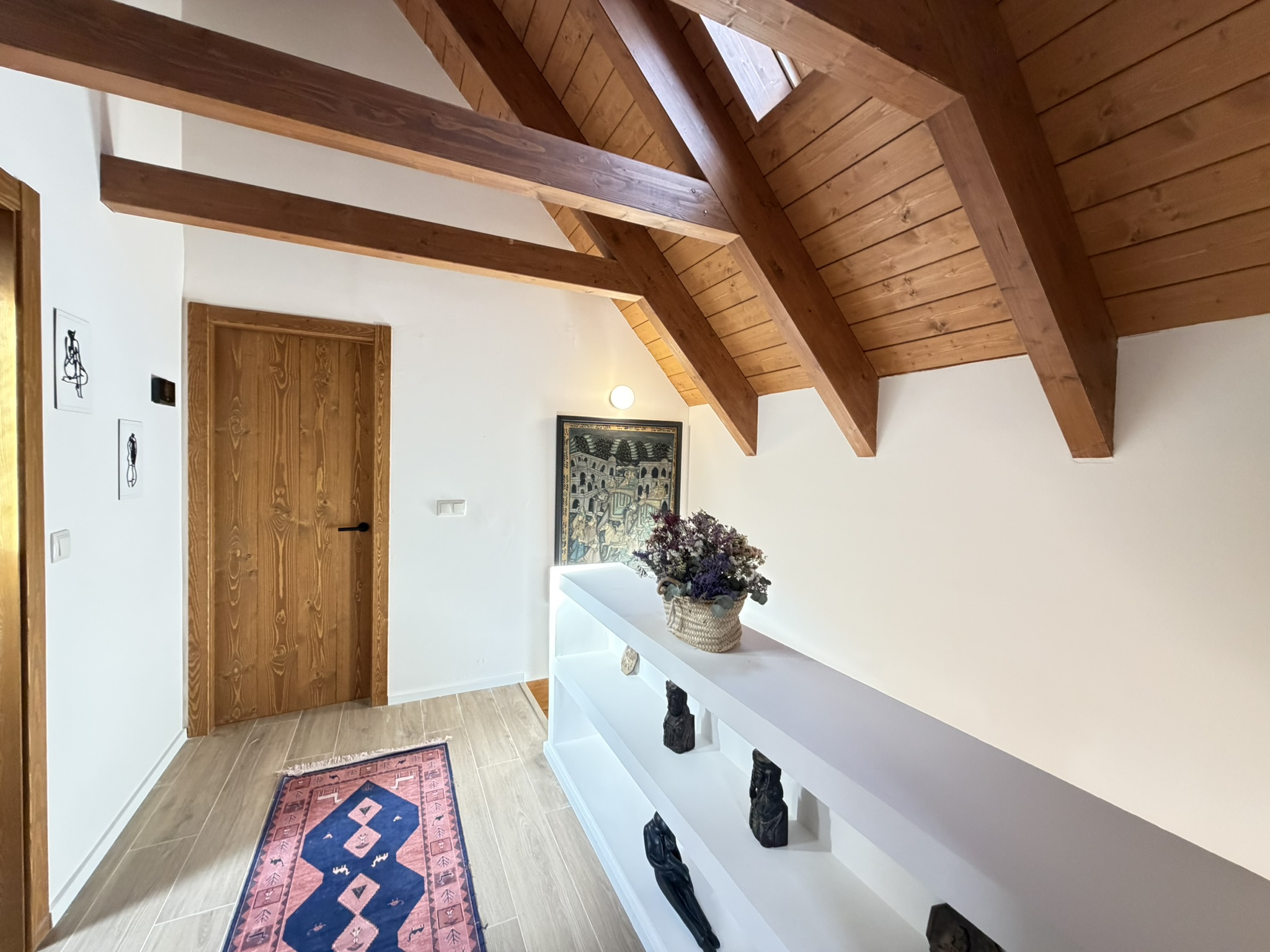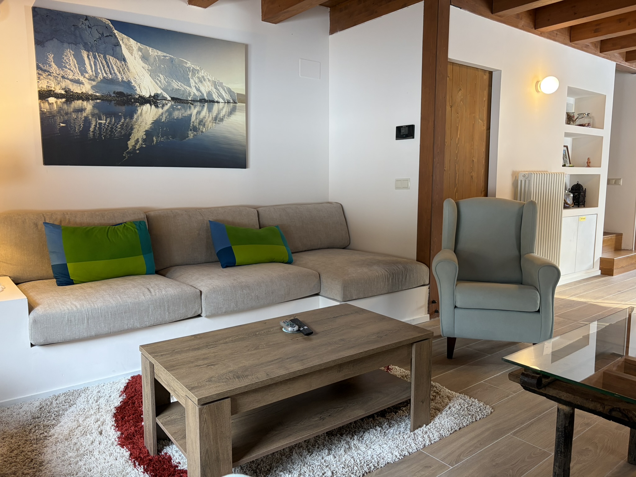 En la planta baja, el salón cuenta una confortable zona de estar con sofá y butacas y una estufa de leña, ideal para descansar después de una excursión o un día de nieve. La cocina es amplia y práctica, equipada para cocinar con comodidad. También, hay un aseo independiente. La planta superior cuenta con dos dormitorios abuhardillados: uno con cama de 180 cm y otro con dos camas de 90 cm, además de un baño con ducha.