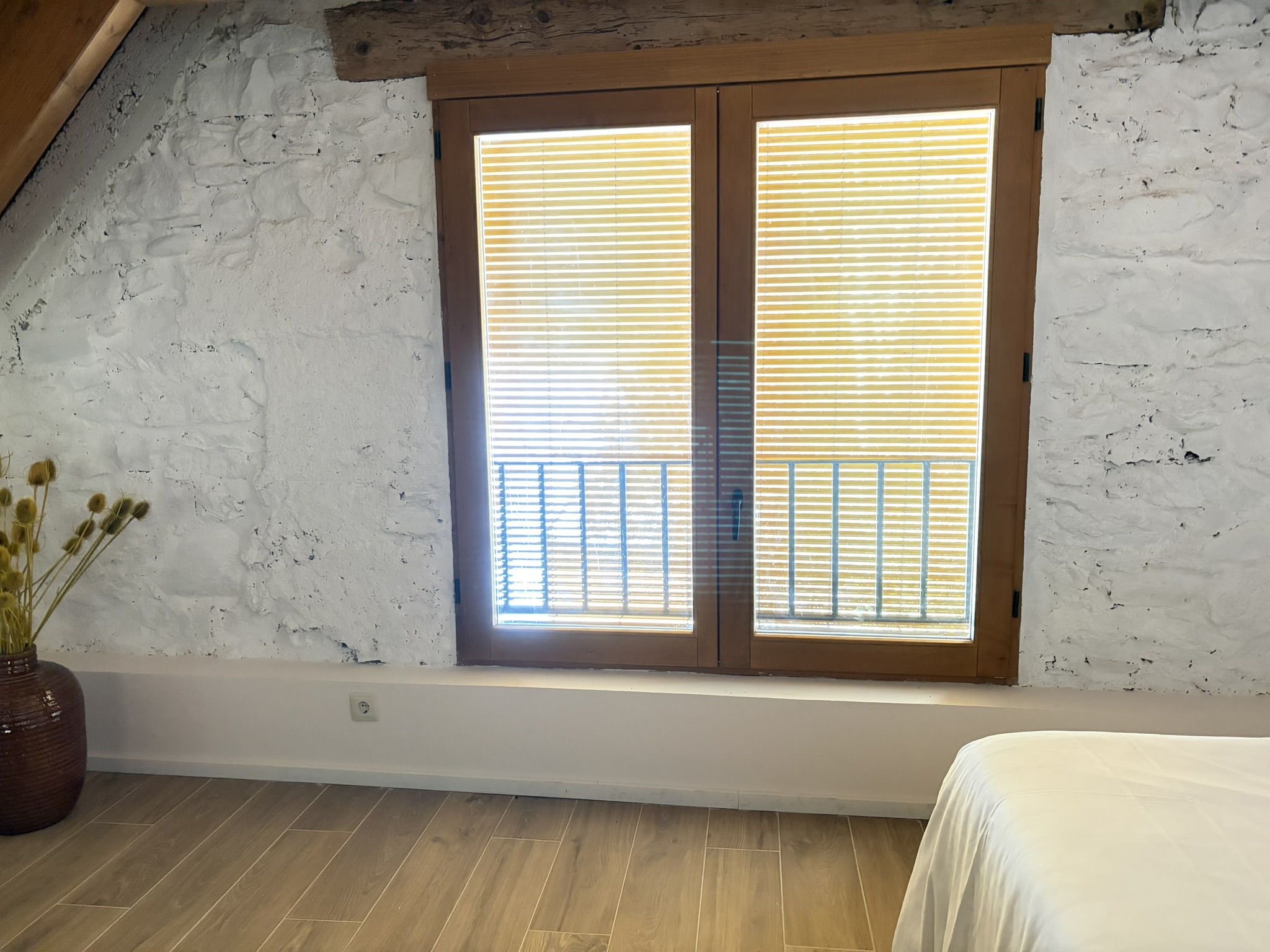 Las ventanas tienen persianas enrollables de madera, que dejan pasar algo de luz y ayudan a mantener un ambiente cálido y agradable.